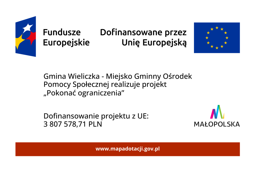 Projekt „POKONAĆ OGRANICZENIA – rozwój usług społecznych skierowanych do osób zależnych, niepełnosprawnych i ich opiekunów” jest realizowany w okresie od 1 kwietnia 2025 r. do 30 czerwca 2029 r., w ramach programu Fundusze Europejskie dla Małopolski 2021–2027, Priorytet 6: Fundusze europejskie dla rynku pracy, edukacji i włączenia społecznego, Działanie 6.33: Wsparcie usług społecznych w regionie – ZIT, współfinansowanego ze środków Europejskiego Funduszu Społecznego Plus.